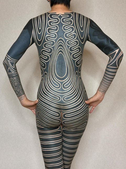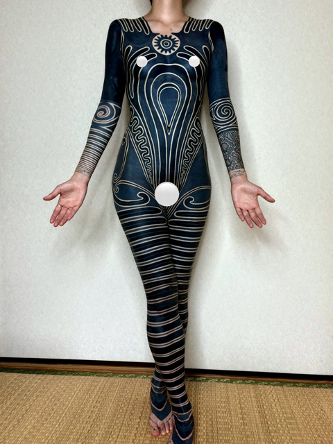 縄文トライバルタトゥーの全身作品です。10年以上前から幾重にもレイヤーを被せてきたこの作品もついにここまでヘビーブラックになりました。