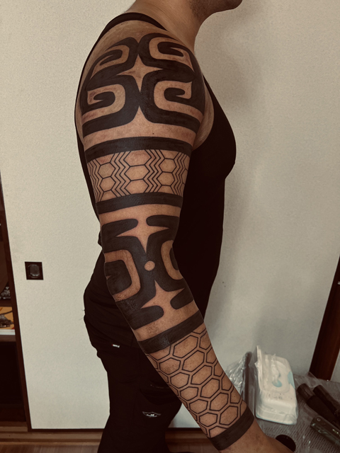 アイヌの服飾パターンと縄文パターンを融合させたトライバルタトゥーによるフルスリーブです。海外のお客様なので2日連続セッションで完成です。