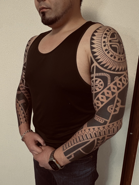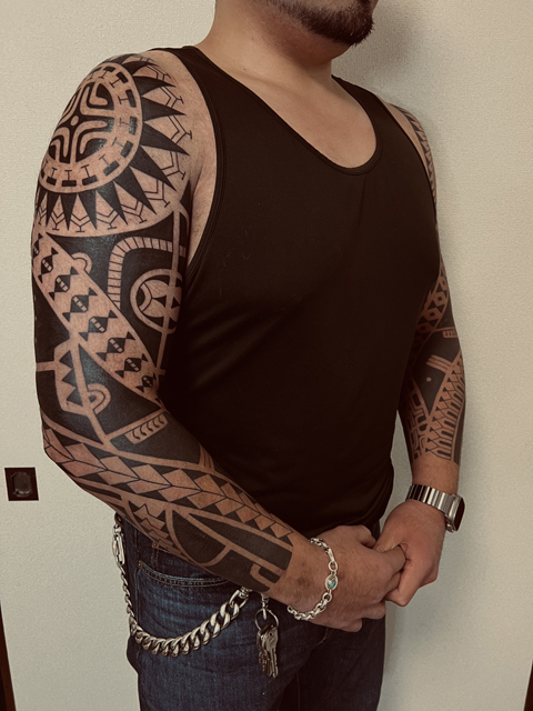 マルケサス、タヒチのトライバルタトゥーデザインによる両フルスリーブです。クライアントのゴッツリした身体によく似合っています。