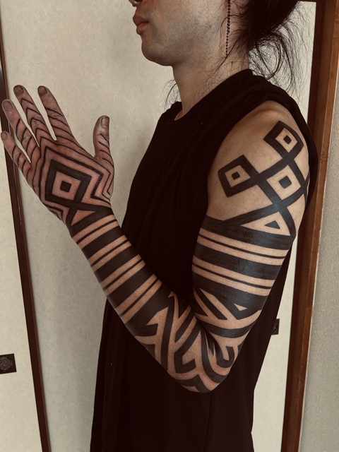 アイヌトライバルタトゥーのフルスリーブデザインです。太い帯と細いラインの2種類の組み合わせで立体感を狙った構成となります。