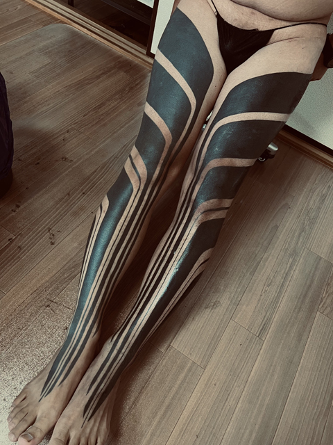 ヤップ島のトライバルタトゥーにインスパイアされたデザインです。両脚にシンメトリーに配置し、線の強弱でスピード感を出しています。