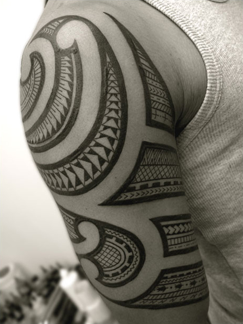 マオリの構図の中をサモアが走るポリネシアントライバルミクスチャータトゥーです。