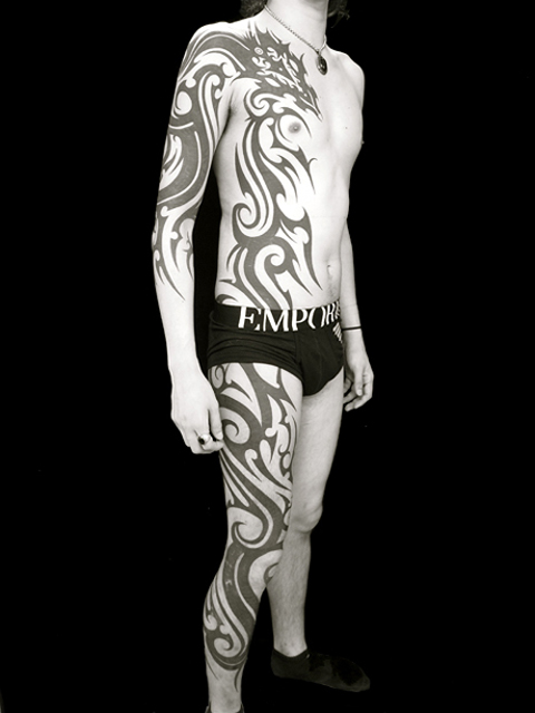 右半身全体を覆うボルネオトライバルタトゥーです。