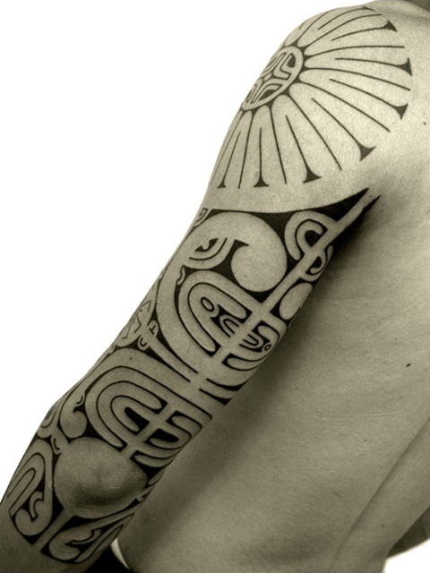 曲線を極限までせめぎあわせて黒面積を抑えたデザインの、白いタヒチトライバルタトゥーです。