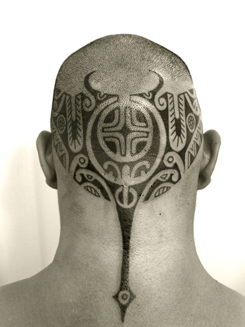 タヒチトライバルタトゥーのエイを頭にあしらいました。
