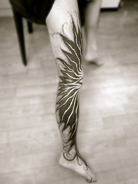 ドットを織り交ぜたりした絵画的なデザイン構成のトライバルタトゥーです。