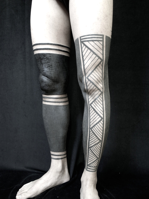 中南米のパターンをフィーチャーした、究めて大胆なデザインのトライバルタトゥーです。