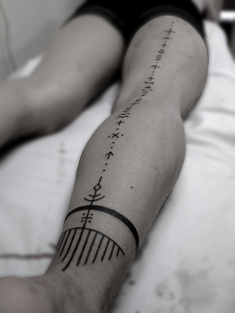 足首から腿上までを直線的に駆け上るトライバルタトゥーです。