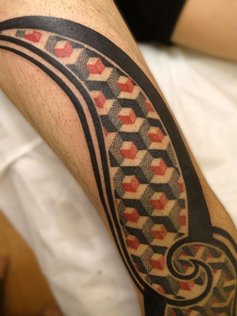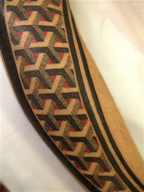 太極シンボルのように組んだボルネオトライバル風の枠内に、赤を差し色として配したドットタトゥーを組み込んだ新しいタイプのデザインです。